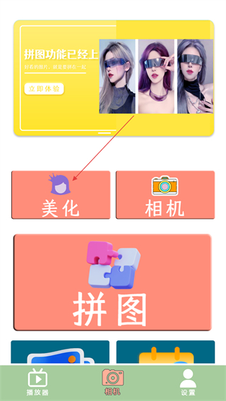 2、在相机功能页面,点击【美化】选项,进入图片选择页面。
