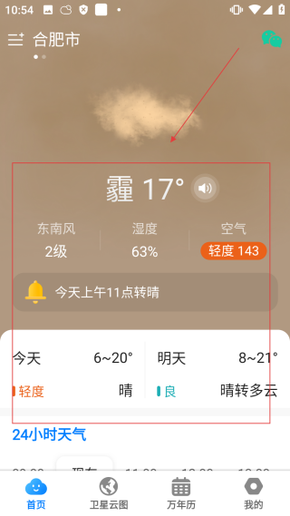 1、进入首页界面,可【查看合肥市实时天气,包括温度、天气状况、风向】等,享受天气查询服务。