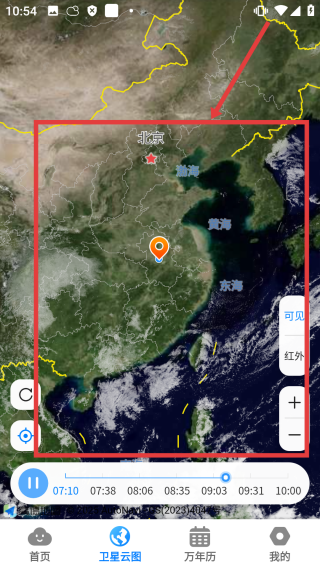 2、进入卫星云图界面,可【查看全国卫星云图,切换可见与红外模式】,了解天气云系分布。