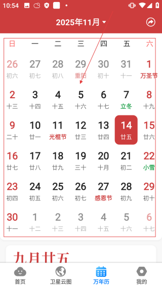 3、进入万年历界面,可【查看2025年11月日历,了解节日、节气】,方便规划日程,享受日历查询服务。