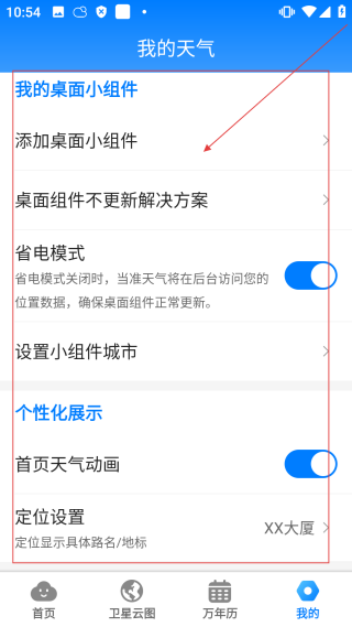 4、进入我的界面,可【添加桌面小组件,设置省电模式、小组件城市】等,管理应用的个性化展示与功能设置。