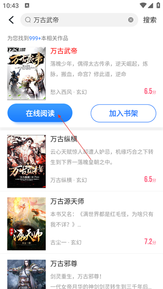 2、在搜索页面输入“万古武帝”并搜索,找到对应作品后点击【在线阅读】按钮。