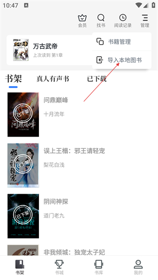 3、在功能菜单中,选择【导入本地图书】选项,进入导入本地图书页面。