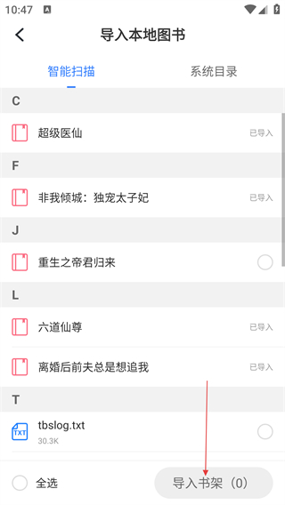 4、在导入本地图书页面,选择要导入的图书后,点击【导入书架】完成本地图书导入操作。