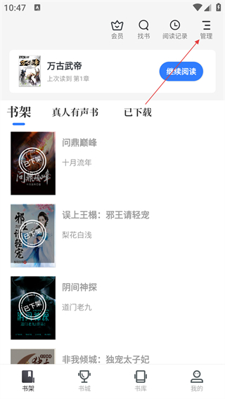 2、在书架页面,点击【管理】按钮,展开功能菜单。