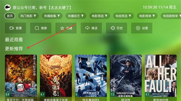 4、添加完后,在OK影视Pro首页,可查看【更新推荐】的影视内容。