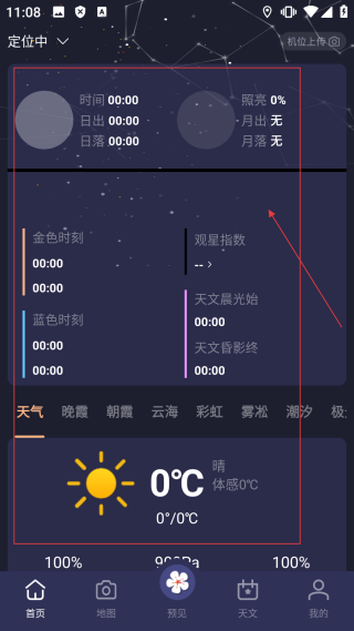 1、进入首页界面,可【查看天文与天气信息,包括日出日落、金色时刻、天气状况】等,享受天文天气综合查询服务。