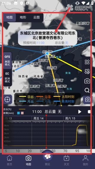 2、进入地图界面,可【查看不同模式的天气地图,了解云量、雨雪】等分布,掌握天气动态。