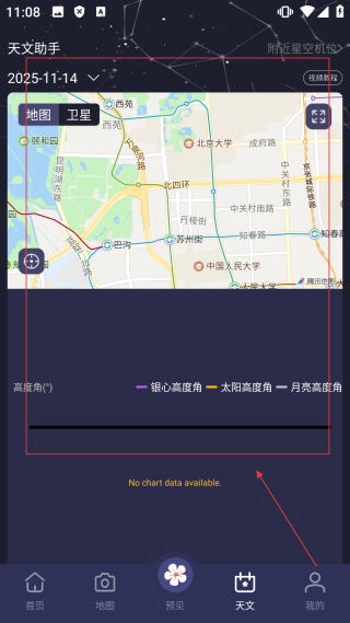 3、进入天文界面,可【查看天文助手功能,了解银心、太阳、月亮高度角】等信息,享受天文查询服务。