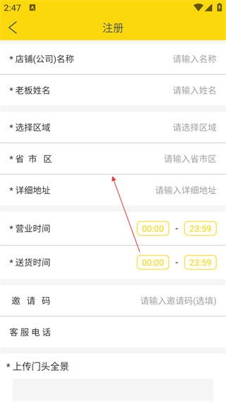 4、在注册页面,填写店铺名称、老板姓名、区域等信息,完成注册操作。