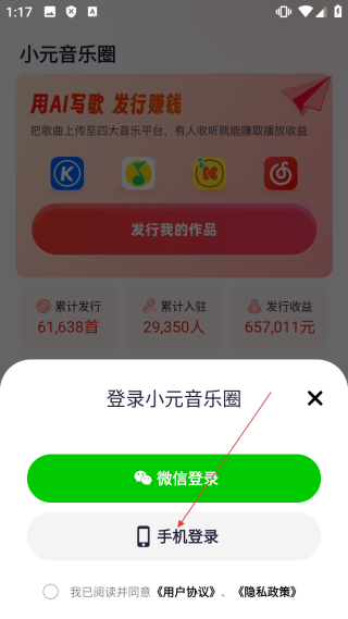 1、在小元音乐圈首页,点击右下角【我的】,弹出登录选项界面。