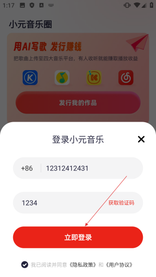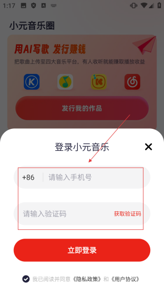 4、在手机登录界面,点击【立即登录】,即可完成小元音乐圈的登录操作。