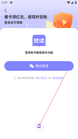 1、打开贤读小说后,点击底部【我的】,进入个人页面,可查看登录、账户等入口。