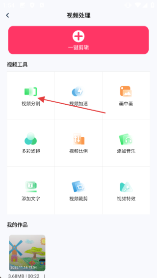 2、在视频处理界面,点击【视频分割】,进入视频选择界面。