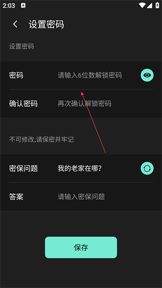 3、在设置密码页面,输入6位数密码、确认密码并设置密保问题后,点击【保存】。