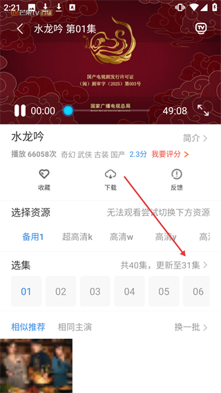 3、在【水龙吟】播放页,点击【选集共40集,更新至31集】区域可选择集数。