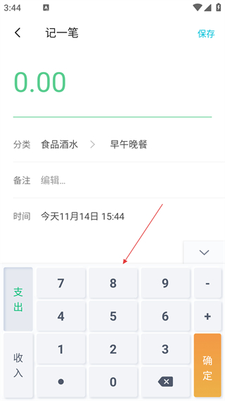 3、在记一笔界面,通过键盘输入金额,选择分类、添加备注后点击保存。