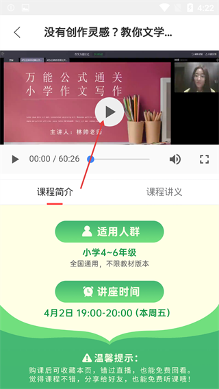 4、在课程播放页,点击视频中央的播放按钮,即可观看【万能公式通关小学作文写作】课程内容。