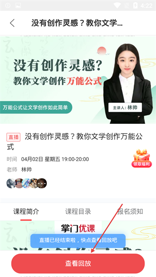 3、进入课程详情页后,点击【查看回放】按钮,即可观看已结束的直播课程回放。