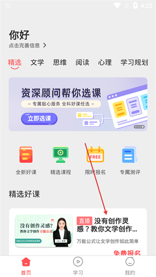 2、在掌门优课首页,找到【精选好课】板块中【没有创作灵感?教你文学创作…】的课程入口,点击进入。