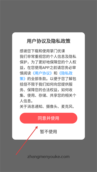 1、使用掌门优课前需审慎阅读【用户协议】和【隐私政策】,点击【同意并使用】即可继续使用。