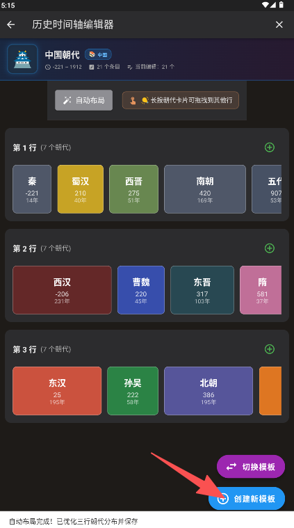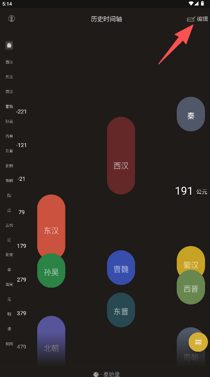 《历史时间轴》是一款以时间轴为核心形式呈现中国历史朝代的工具。界面采用深色背景,左侧纵向清晰列出各朝代名称与起止年份,右侧通过不同颜色的椭圆形图块直观展示朝代更迭顺序与并存关系。顶部设有编辑功能,这种设计将复杂的时空信息可视化,便于快速建立历史框架,把握朝代脉络与关键时间节点。