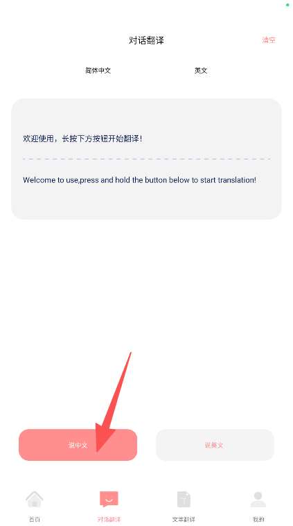 3、对话翻译模式操作简单,通过长按录音按钮即可完成语音输入并实时获取翻译结果。