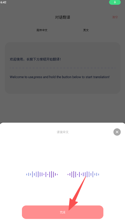 3、说完后松开按钮或点击“完成”将自动识别并显示翻译结果。