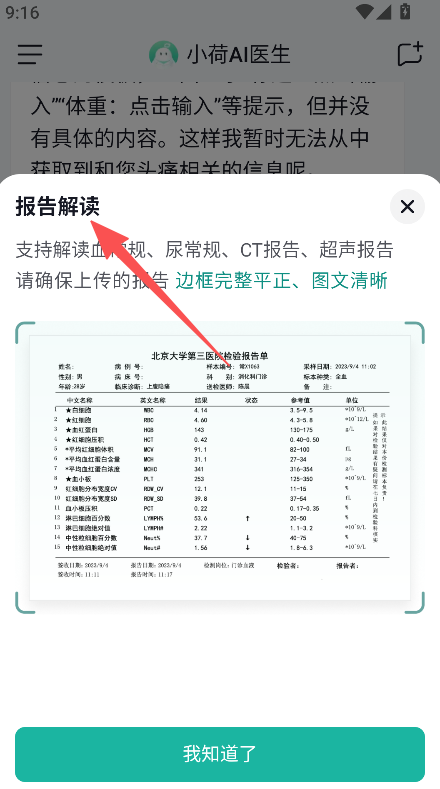 1、进入报告解读,上传医疗报告,获取报告解读信息。