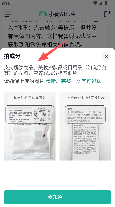 2、提供拍成分功能,可解读食品、美妆护肤品等配料成分,助力用户了解产品成分信息。