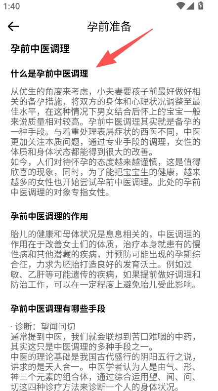 2、知识讲解详细,孕前中医调理从概念、作用到手段逐一说明,帮助用户深入理解调理重要性。