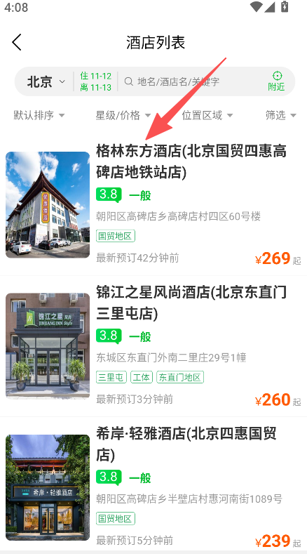 2、查看酒店列表,选择心仪酒店(如格林东方酒店)。