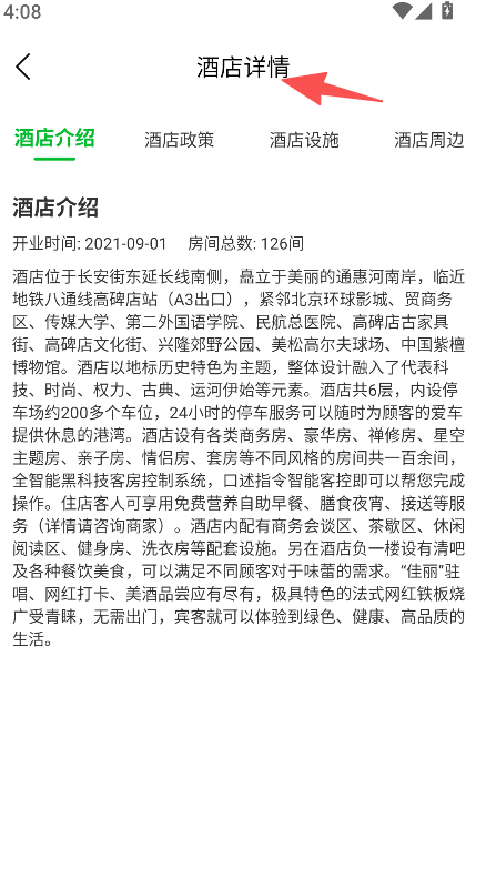 3、进入酒店详情,查看酒店介绍、政策、设施等信息。