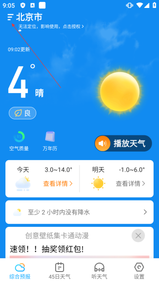 1、在天气界面,点击【左上角菜单按钮】,进入城市管理界面。