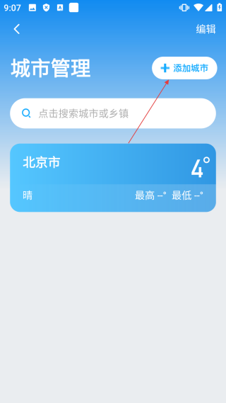 2、在城市管理界面,点击【添加城市】,进入城市选择界面。
