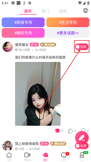 3、在圈子页面,看到感兴趣的用户动态,点击【私聊】,可进入与该用户的私聊界面啦。