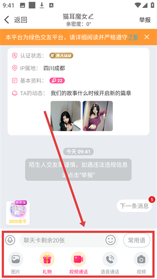 4、在私聊界面,可使用图片、礼物、视频通话等功能,与对方进行多样互动,增进交流哦。