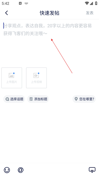 4、在快速发帖界面输入内容,可上传图片、视频、选择话题、添加标题后点击发表。