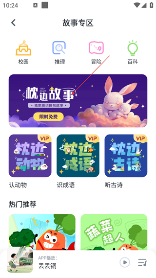 2、在故事专区页面,点击【枕边故事】,进入枕边故事专辑页面。