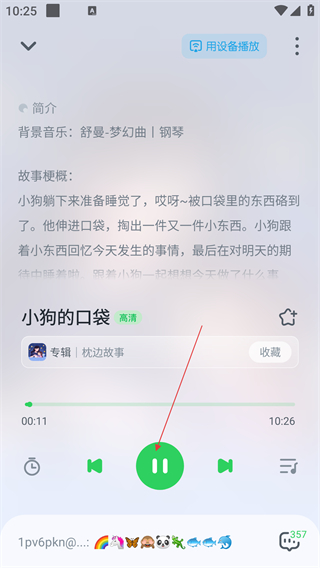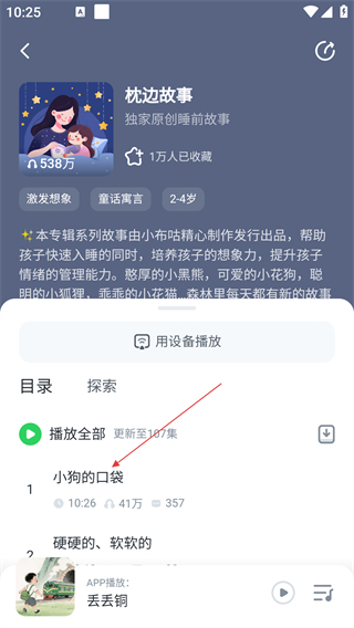 3、在枕边故事专辑页面,点击【小狗的口袋】故事条目,进入故事播放页面。