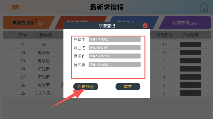 3、在弹出的窗口中填写曲目信息并点击“点击登记”提交请求。