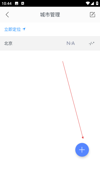 2、在城市管理界面,点击右下角【+】,进入城市搜索界面。