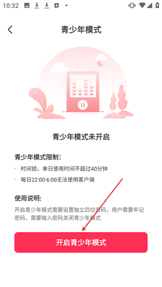 3、在青少年模式页面,可点击【开启青少年模式】按钮开启该模式。