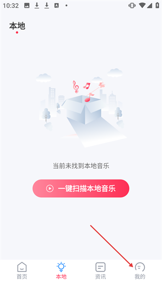 1、在该音乐应用【本地】页面,可点击【一键扫描本地音乐】查找本地音乐,点击【我的】进入个人中心。