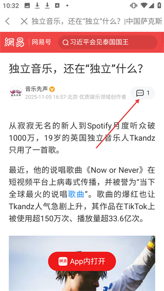 3、在【独立音乐,还在“独立”什么?】页面,点击右上角评论按钮,进行评论。