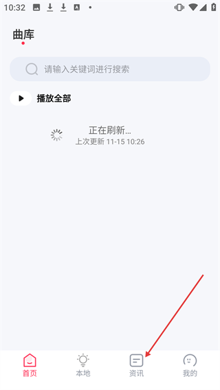1、在音乐应用【曲库】页面,点击底部【资讯】按钮可进入资讯页面。