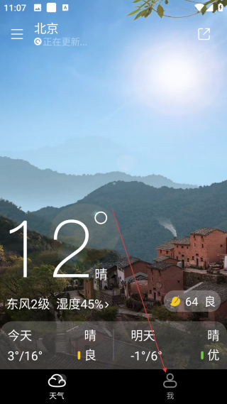 1、在天气界面,点击右下角【我】,进入个人中心界面。