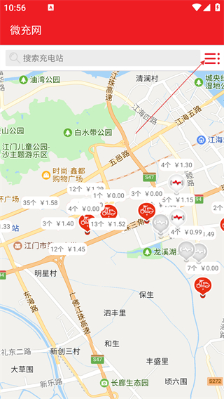 1、在微充网地图页面,点击右上角三条横线图标,进入电站列表页面。