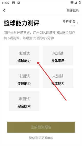2、在篮球能力测评界面选择【运球能力】测评项。