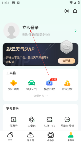 1、在天气界面,点击【未登录】,进入个人登录界面。